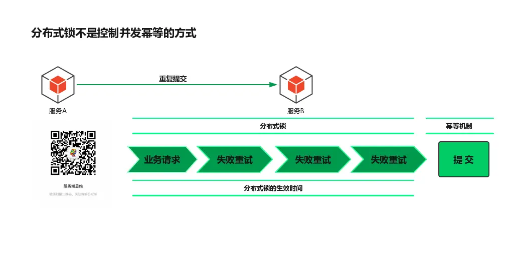 注意的是,为了避免并发场景,我们可以通过锁机制,例如悲观锁与乐观锁保证数据的唯一性。这里,分布式锁是一种经常使用的方案,它通常情况下是一种悲观锁的实现。但是,很多人经常把悲观锁、乐观锁、分布式锁当作幂等机制的解决方案,这个是不正确的。并发控制只是保证临界区资源的安全,不出现脏数据,如果并发控制,多次提交是合法的,只是业务方面不合法,所以做幂等控制 。