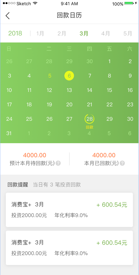 首先会显示出当前日期,以及给定的回款的数据显示;日历区域可以左右滑动,上面月份会对应切换;上面月份可以左右滑动,点击对应月份完成切换