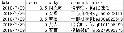 tomato = tomato.append({'date':item['time'].split(' ')[0],'city':item['cityName'], 'score':item['score'],'comment':item['content'], 'nick':item['nick']},ignore_index=True)
