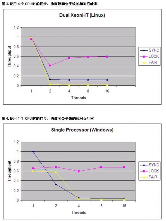 图 1 和图 2 中的图表以每秒调用数为单位显示了吞吐率,把不同的实现调整到 1 线程 synchronized 的情况。每个实现都相对迅速地集中在某个稳定状态的吞吐率上,该状态通常要求处理器得到充分利用,把大多数的处理器时间都花在处理实际工作(计算机随机数)上,只有小部分时间花在了线程调度开支上。您会注意到,synchronized 版本在处理任何类型的争用时,表现都相当差,而 Lock 版本在调度的开支上花的时间相当少,从而为更高的吞吐率留下空间,实现了更有效的