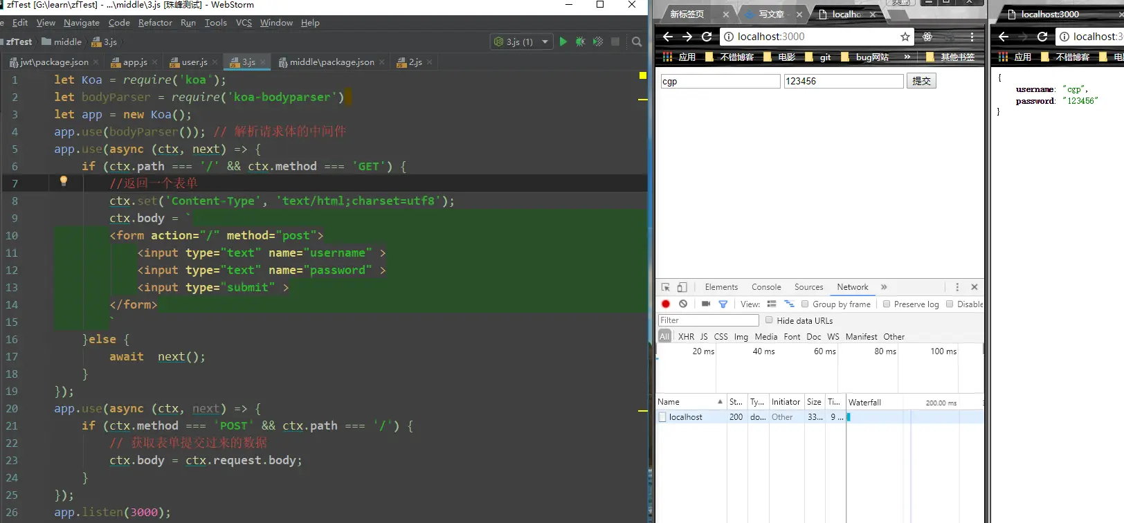 - 用来解析请求体的中间件,比如获取post提交的表单数据,通过koa-bodyparse解析后就能获取到数据。看demo