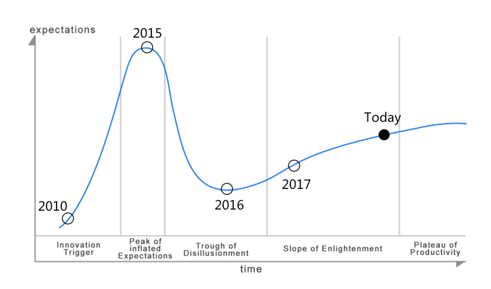 • 第三个阶段-泡沫出现的低谷期:技术局限和缺点暴露、部分产品运营艰难甚至死掉、媒体兴趣下降、一些用户验证失败、行业前景不明
