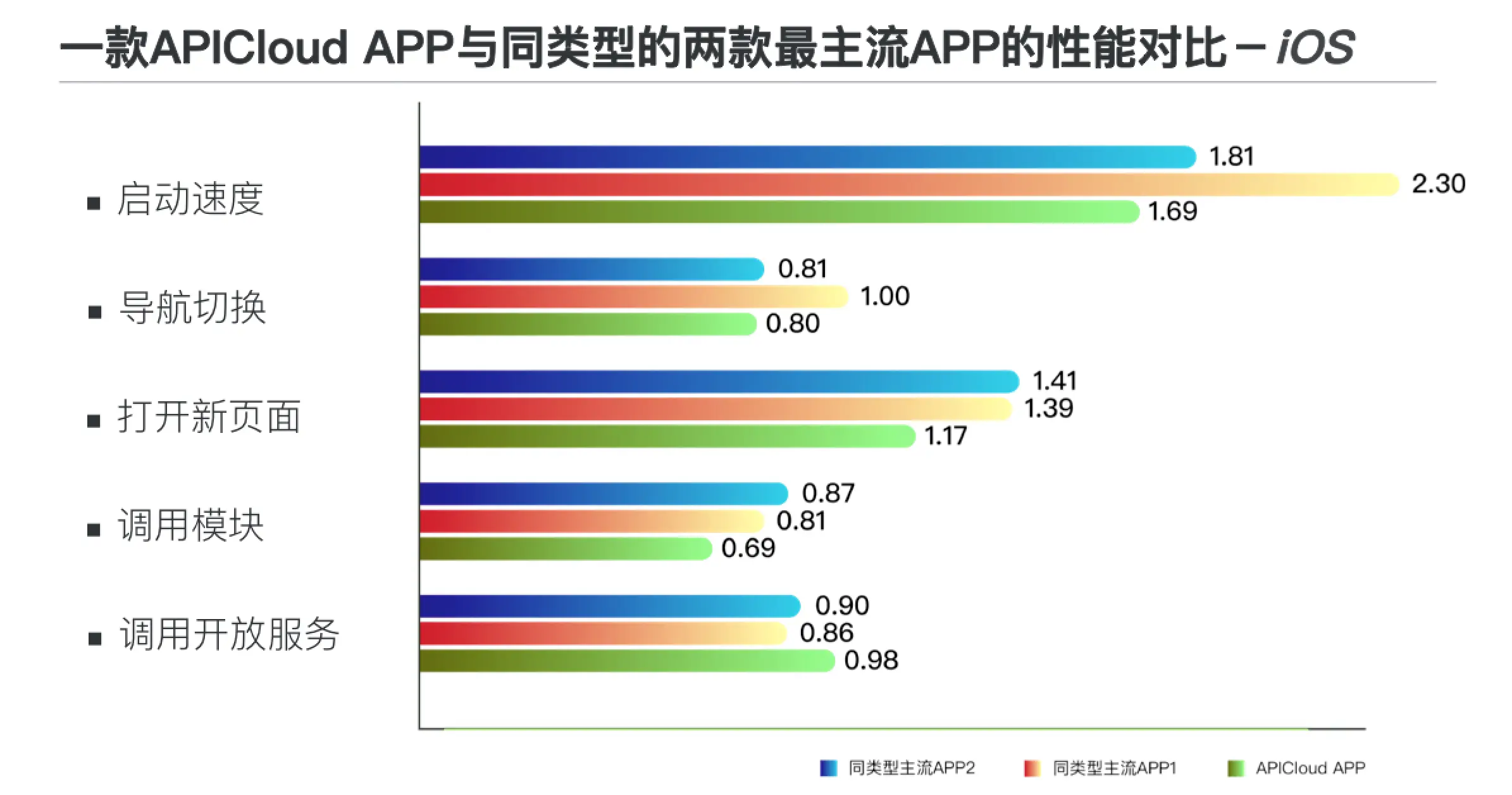我们对比分析了一款在APICloud平台开发的电商app,分别与淘宝和京东两款app在5个方面进行对比,测试覆盖了所有主流机型,测试时间以秒为单位,测试结果性能基本无差别。