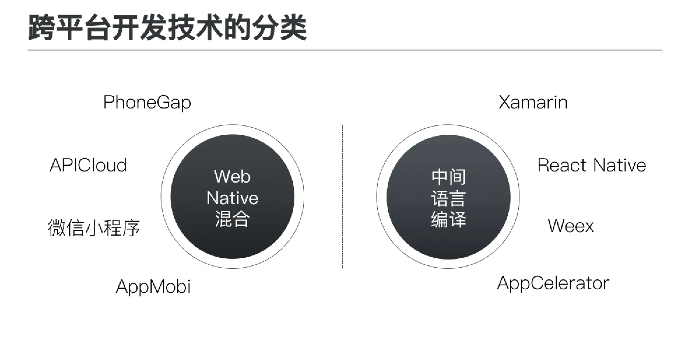 其实今天,两个类型中很多的混合开发技术产品都已经完成了平台化、组件化和生态化的发展过程,例如:小程序、React Native、APICloud等。