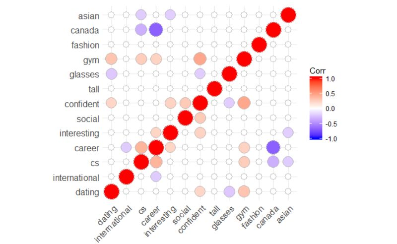 有些变量对于能否成功约会可能比较有预测力,不过很难确定,因为样本较小: