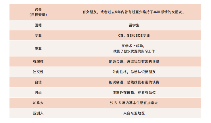 在上面这些情况中,我按照是否符合标准会赋予 1 或 0 这两个值。所以,我们是在衡量人们的上述属性和能找到对象之间的关系。