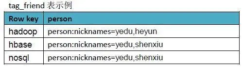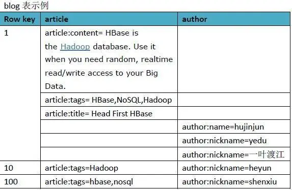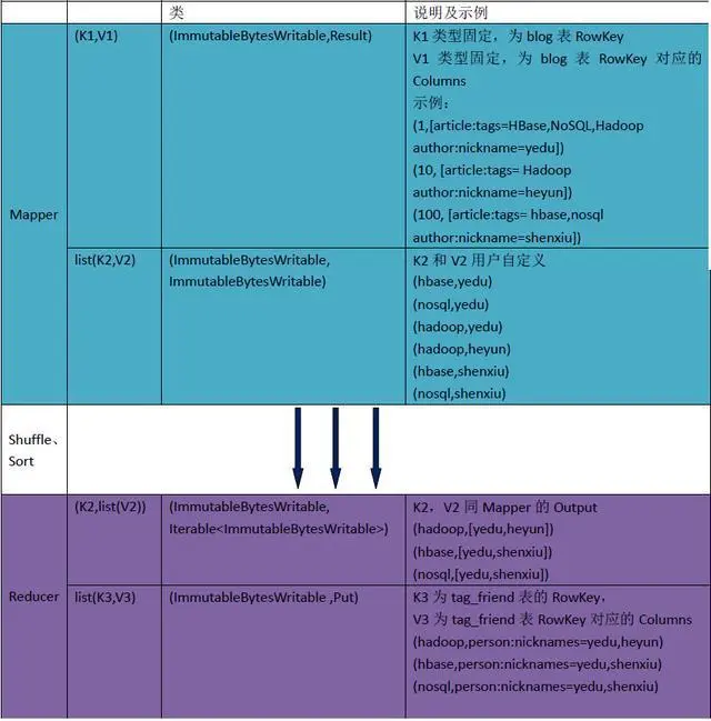 我们还是以最初的blog例子来进行示例分析,业务需求是这样:找到具有相同兴趣的人,我们简单定义为如果author之间article的tag相同,则认为两者有相同兴趣,将分析结果保存到HBase。除了上面介绍的blog表外,我们新增一张表tag_friend,RowKey为tag,Value为authors,大概就下面这样。