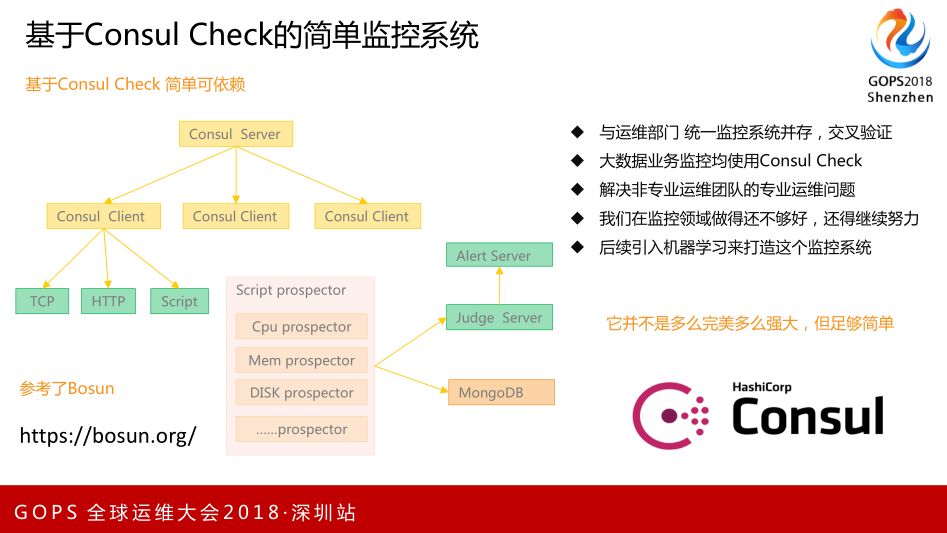 它并没有很强大,它只是很简单、很够用,最核心的点和整个的骨架都是Consul完成的,报警、业务是我们自己开发的,也是我们自己需要做的东西。核心是如何采集,采集时有很多监控脚本,有没有现成的。