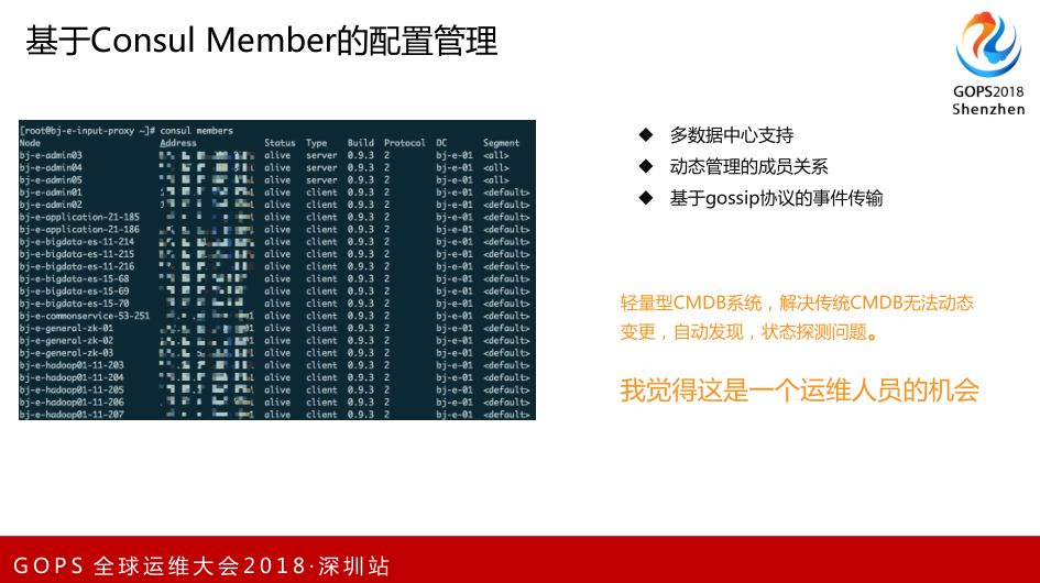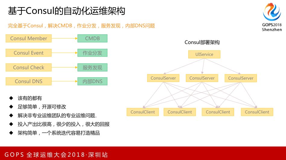 基于Consul,我们做了自动化运维架构。我们用Consul Member解决CMDB,可以动态发现节点,动态摘除。