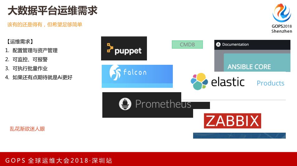 那时候我们把整个运维需求进行精简,如果有基本的运维需求,我们应该具备哪部分,包括配置管理和资产管理是我们传统说的CMDB;监控系统要可监控、可报警,我们在做批量作业时需要批量作业的工具,包括Puppet、Ansible等。