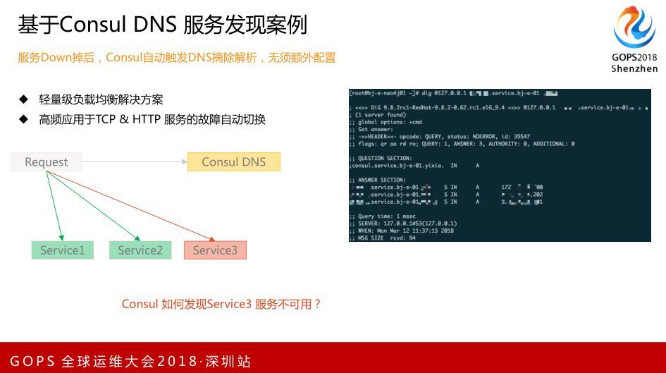 我可以把一个服务注册到一个Consul上,解析域名时会返回三个地址,分别是同一个服务有同一个域名,当这个服务不可用时,我们根本不需要做其他东西,这用的是Consul内部事件感知的技术,它可以动态的在解析里摘除,内部看延时是秒级的,这个特性可以应用于很多场景,你可以自己掌控很小的服务发现和自动切换,以及简单的负载均衡产品。