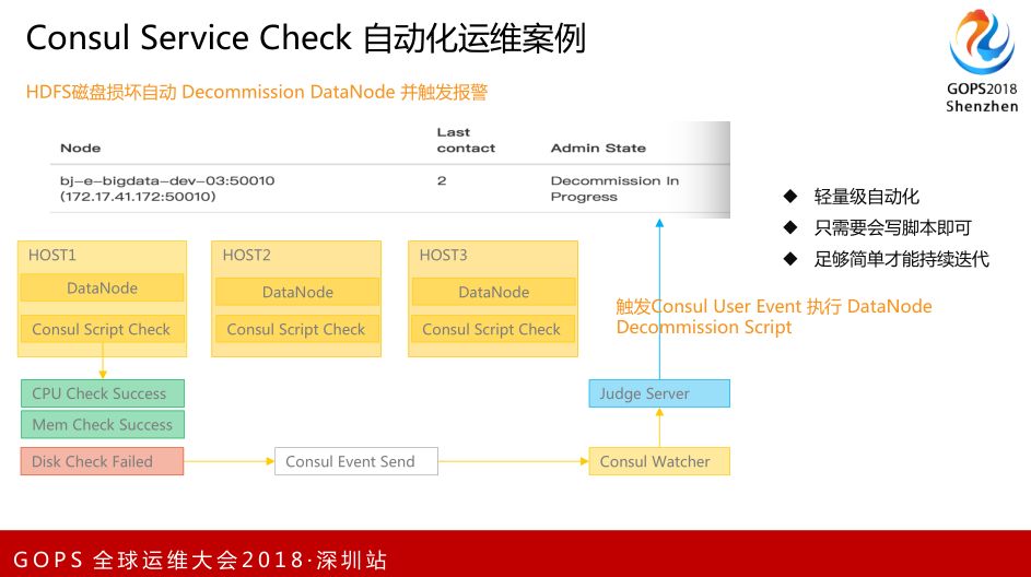 这是Hadoop一个节点磁盘损坏的时候如何让它做自动化的东西。简单来说是事件触发,自动调Consul Event事件,它会把具备磁盘损坏的节点,自动触发下线的操作。