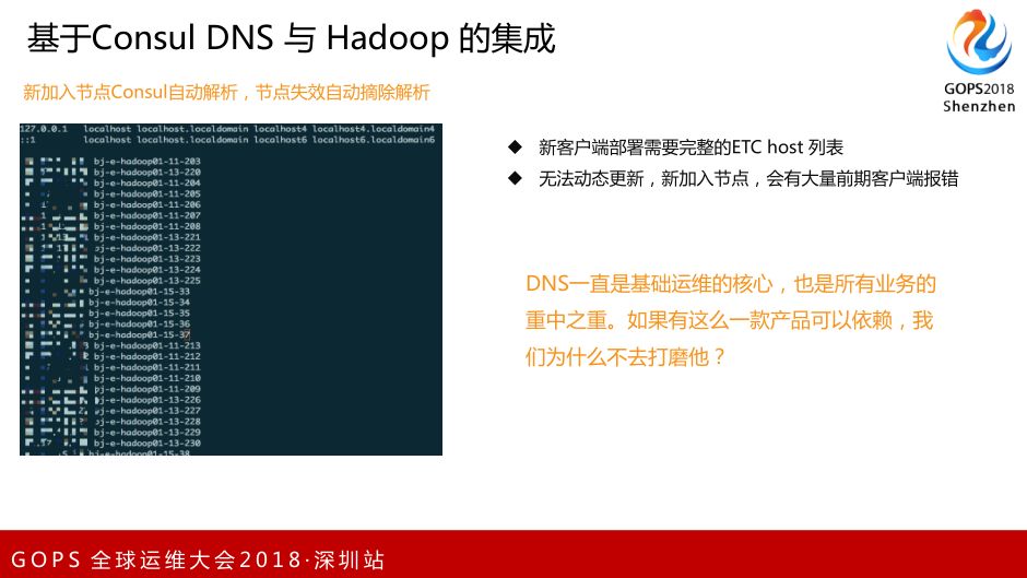 Consul DNS与Hadoop的集成,在阿里、搜狗和很多公司不算问题,但在处于高速发展期的公司说,这个问题是普遍的。有一定规模的公司,他们管理Hadoop节点时,大部分用Host做解析,每次资源变动都要一定要下发ETC Host的文件,让每台机器知道你是谁,我是谁。