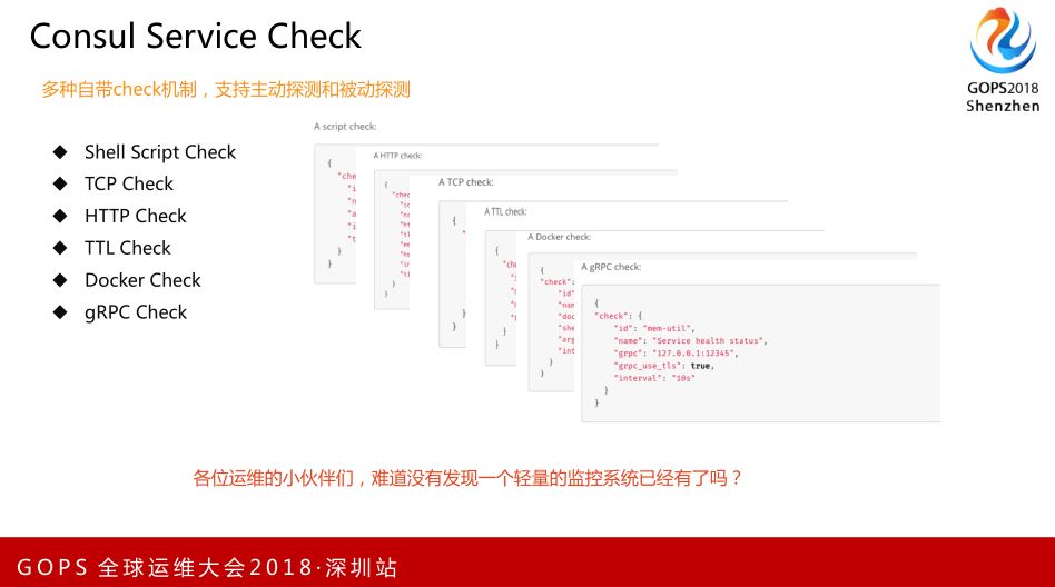 有时候我们去用小米、Prometheus、zabbix时,有的天然集成的包我们可以用,但有很多时候我们需要定制化监控某些服务,这时候运维人员只需要写一个简单的脚本,可能不需要很多的开发能力,写了一些脚本采集信息把服务监控起来,就可以用Consul Service Check去触发和管理。大家可以看看这个服务。