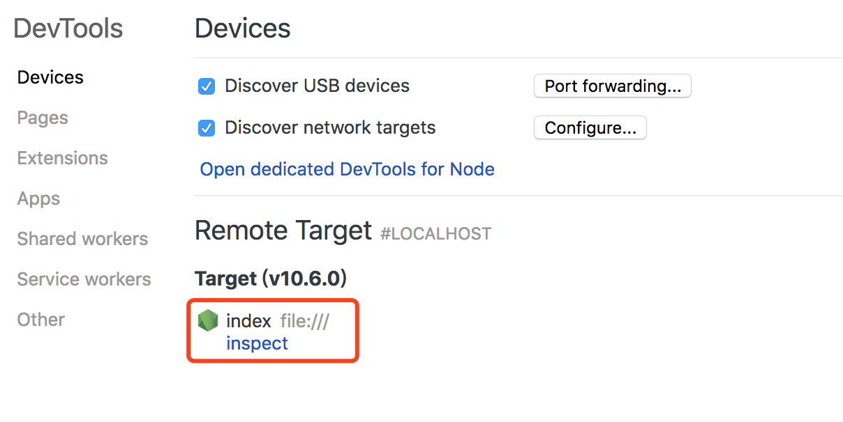 inspect协议默认端口为9229);注:此方式需要项目以debug模式进行启动;