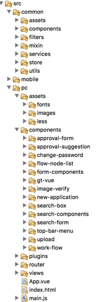 下图是我们某一个项目的结构。它相对复杂,包括PC端和移动端两部分,共用的部分就在common文件里。它包括assets(图片、资源信息)、components(一些公共的组件)、过滤器、mixin(一些用于合并的模块)、service(公共服务)、stores(数据存储)、utils(预处理函数,工具)。