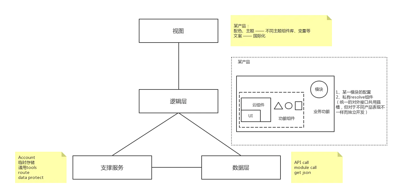 数据层会提供一些支撑服务,主要是账号服务,与临时存储相关。我们也针对数据层进行了划分:API call借鉴RPC思维,形成通用发请求的方法;Model call是比较早期的一种模式,会把具体的请求服务分装好;get json是针对某一部分没有封装成后端接口源数据的文件。