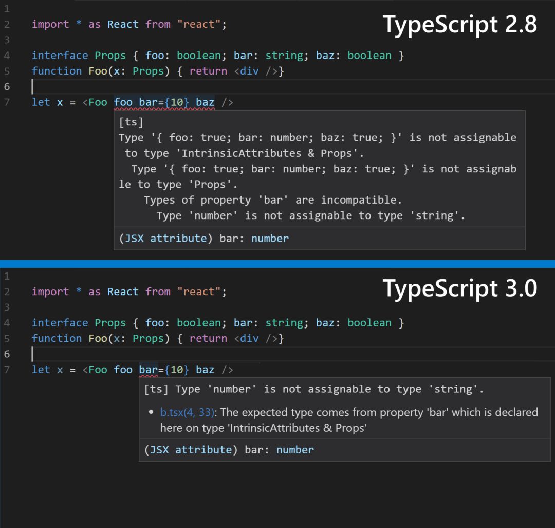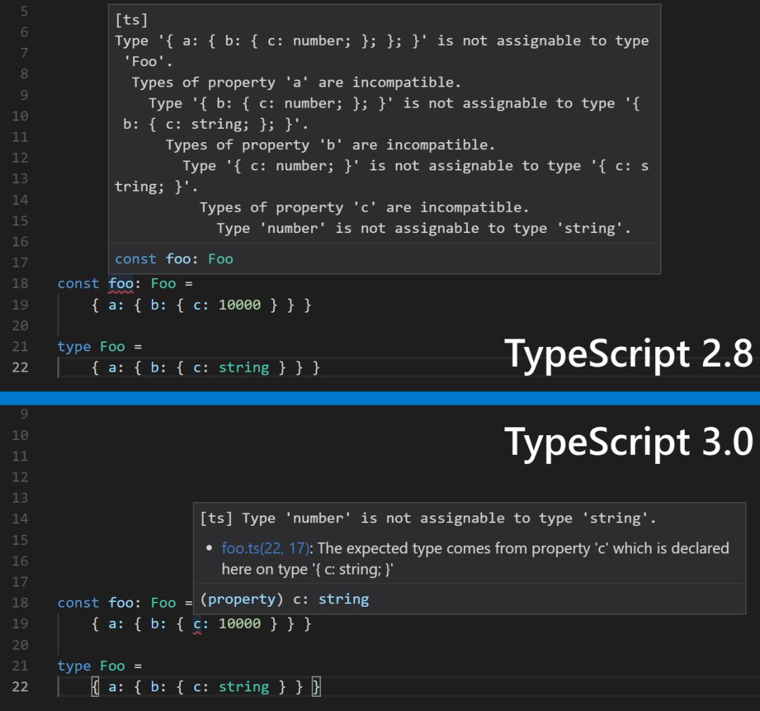 社区希望对错误消息进行改进,虽然我们没有全部完成任务,但经过努力,还是在 TypeScript 3.0 中带来了一些改进。