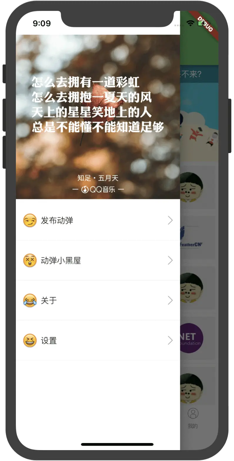 上一篇中我们仅仅在侧滑菜单中放置了一个Center组件并显示了一行文本,这一篇中需要实现的侧滑菜单效果如下图: