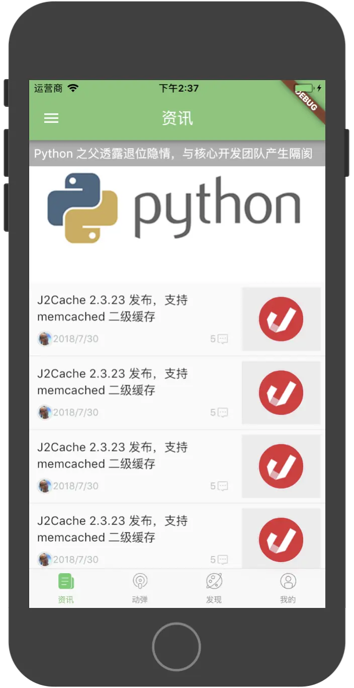 资讯列表的头部是一个轮播图,可以左右滑动切换不同的资讯,下面是一个列表,显示了资讯的标题,发布时间,评论数,资讯图等信息。