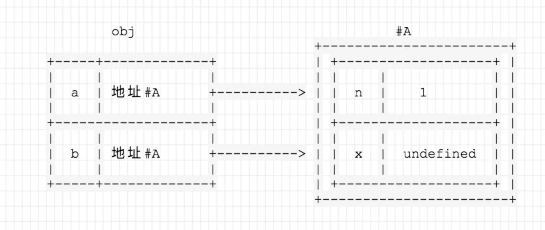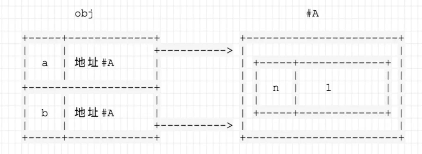 执行 obj.a = {n: 1}; obj.b = obj.a后obj对应的引用是这样的
