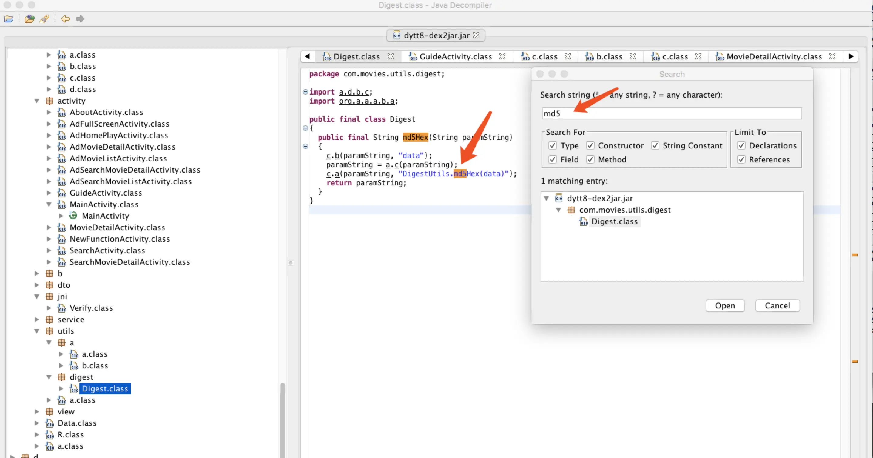 下载dex2jar和JD-GUI这两个工具,dex2jar 将 apk 转为 jar 文件,以供JD-GUI打开查看源码