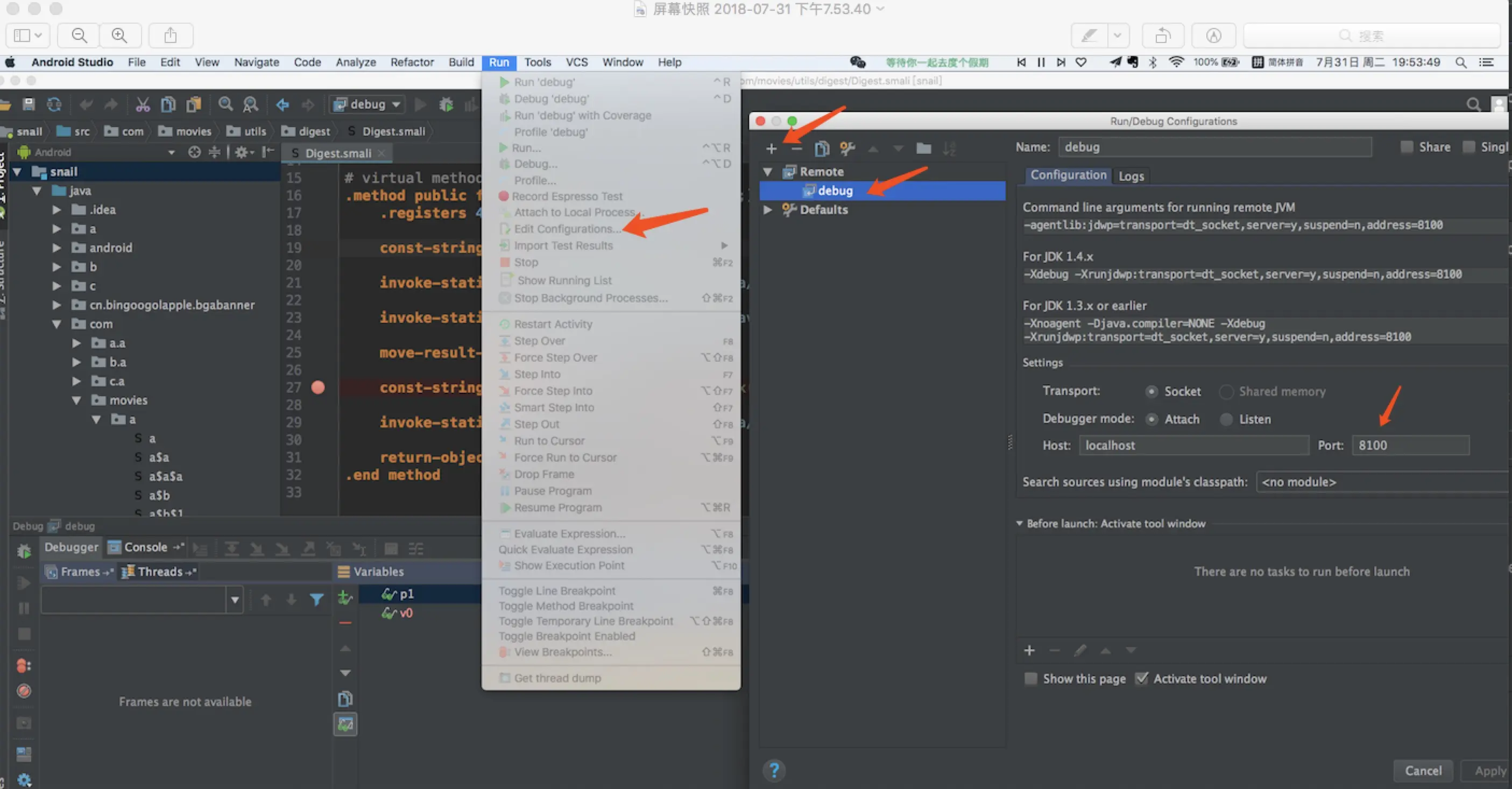 然后在AS中点击Run---Debug