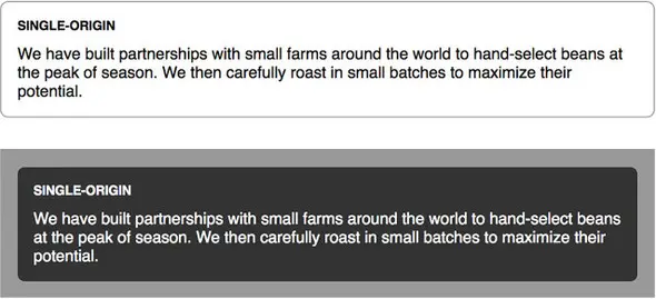 你有两个面板,不过它们仍然看起来是一样的。现在,再一次定义这些变量,但这次是在一个不同的选择器中。下一个代码片段是深色容器的,它有深灰色的背景色,以及小小的padding和margin。同时,它也重写了两个变量。添加到你的样式表吧。