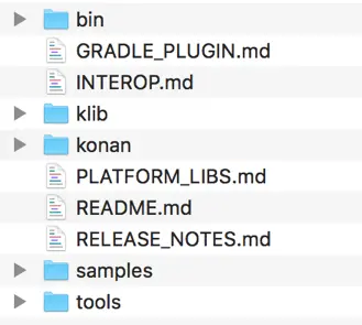 图16-2 Kotlin的Native编译器目录结构 在Kotlin Native官方提供的示例中,系统自带了针对不同平台的例子,并且这些例子都是可以直接编译运行的。由于Kotlin Native本身是一个gradle构建的项目,所以可以使用idea直接打开Kotlin Native目录下的samples文件,idea会自动识别该项目。 ##16.1.3 编译器konan 打开kotlin-native-macos-0.6文件,其目录结构如图15-3所示。其中,bin目录包含众多的与Kotlin Native相关的执行命令,klib目录则主要包含Kotlin的标准库的关联元数据文件以及针对各个目标平台的bc文件,konan主要包含编译器依赖的一些jar包和一些已经编译好的项目实例,可以使用IntelliJ IDEA直接导入。