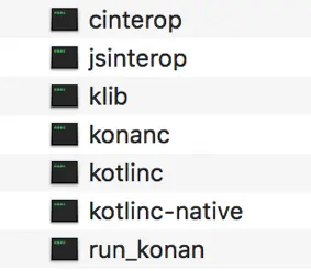 到此,就可以得到Kotlin的Native编译器了,它通常位于项目的./dist/bin目录下,打开bin文件可以看到Native编译器的相关信息,它有7个可执行程序构成,如图15-2所示。通过对比发现,Native编译器的目录结构和Kotlin Native官方提供的编译器的内容是一样的。然后,就可以利用Native编译器编译应用程序了。例如: