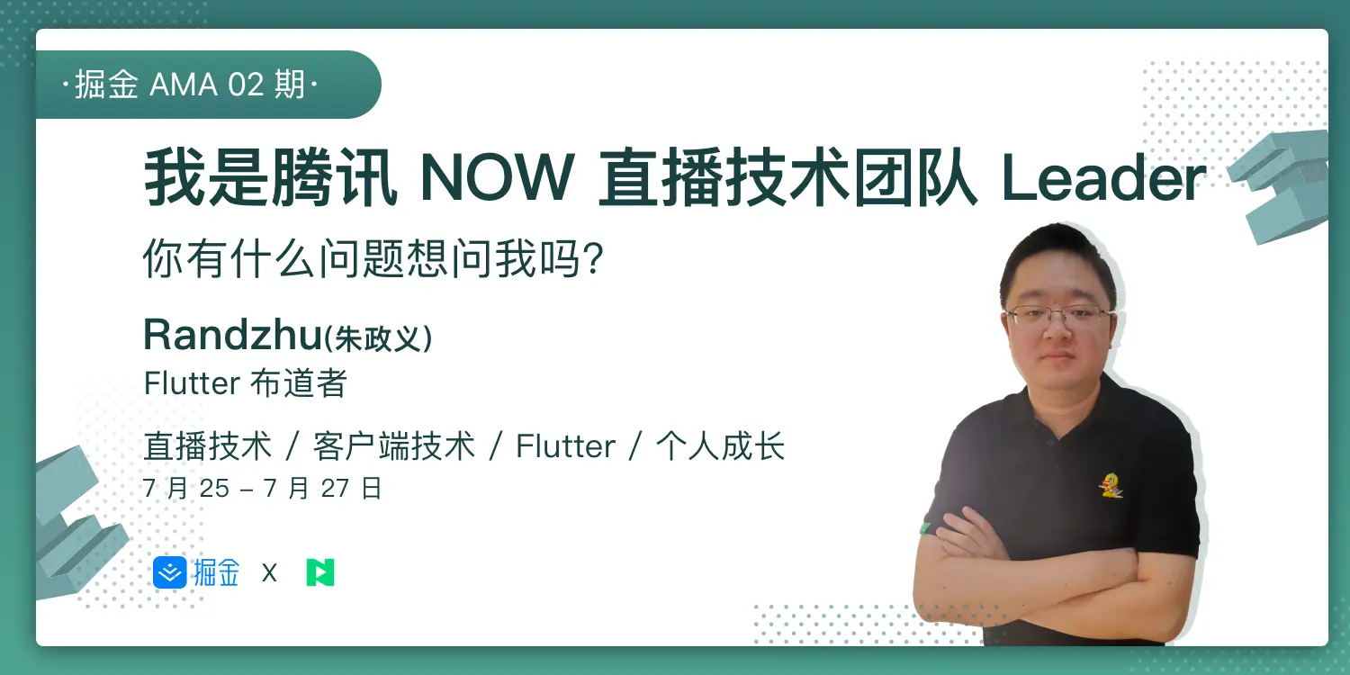 上周 沸点,掘金团队请来了腾讯 NOW 直播技术团队 Leader、Flutter 布道者 -- @Randzhu (朱政义) 做了为期三天的 Ask Me Anything (AMA) 活动。我们在此精选了一些来自用户的提问及 Randzhu 的回答。