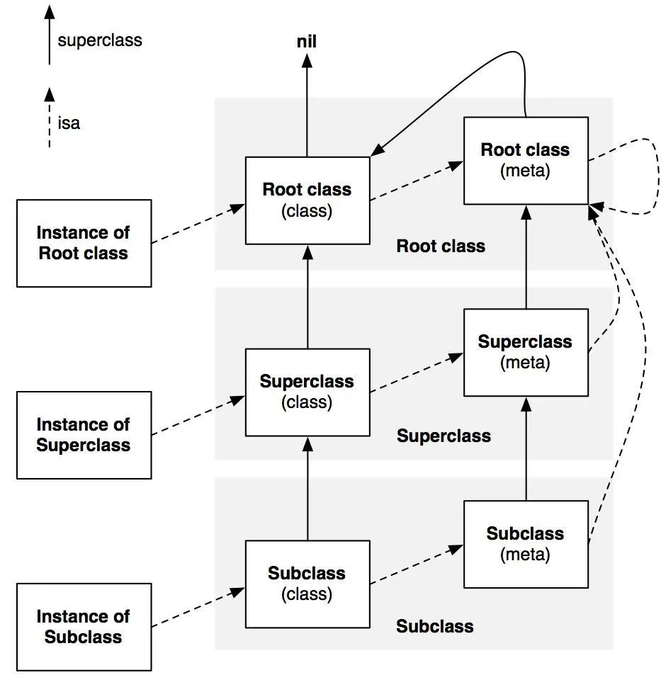 回顾一下之前的内容,OC 中的对象分为 instance、class与meta-class,它们的 isa 与 superclass 的指向关系如图所示。