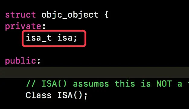 我们都知道 Class 中有 isa 和 superclass,但是这里成员变量 ISA 前面有两个斜线,它被注释掉了,很奇怪,这是因为 objc_class 是继承于 objc_object 的,来看一下 objc_object 的结构就明白了。