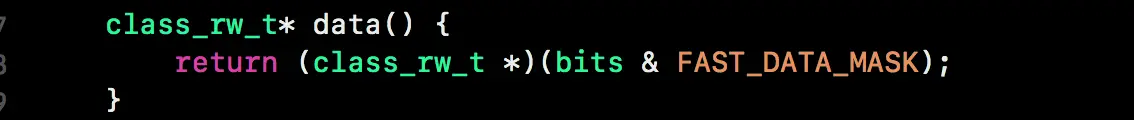bits 是一串 64 位的二进制数。不同的位上写着不同的数,控制它和不同的掩码 A_MASK、B_MASK、C_MASK 相与,就可以得到我们想要的位上的数据。bits & FAST_DATA_MASK 就可以得到 class_rw_t 的地址。