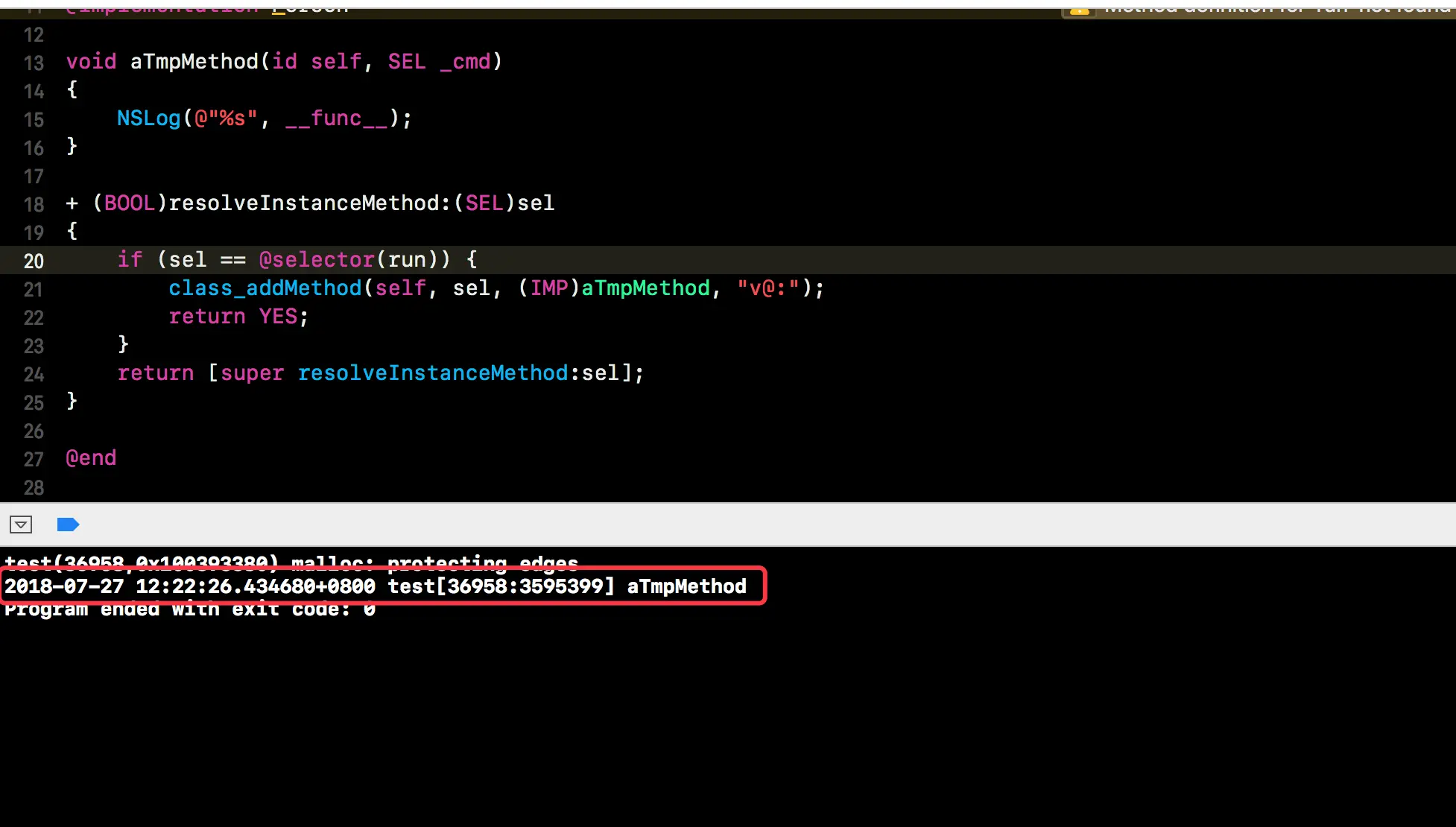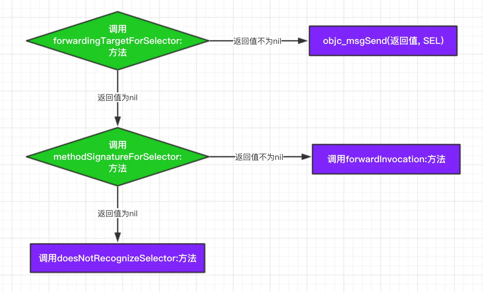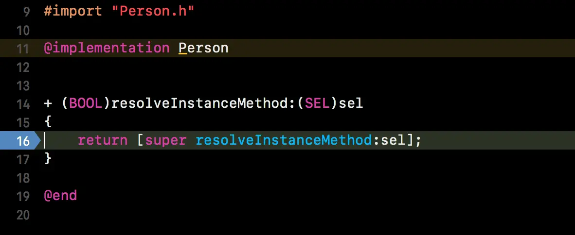 methodSignatureForSelector:返回不为 nil,则会调用forwardInvocation:方法。- 来到这个方法后,就算什么都不处理,运行程序也不会崩溃了。