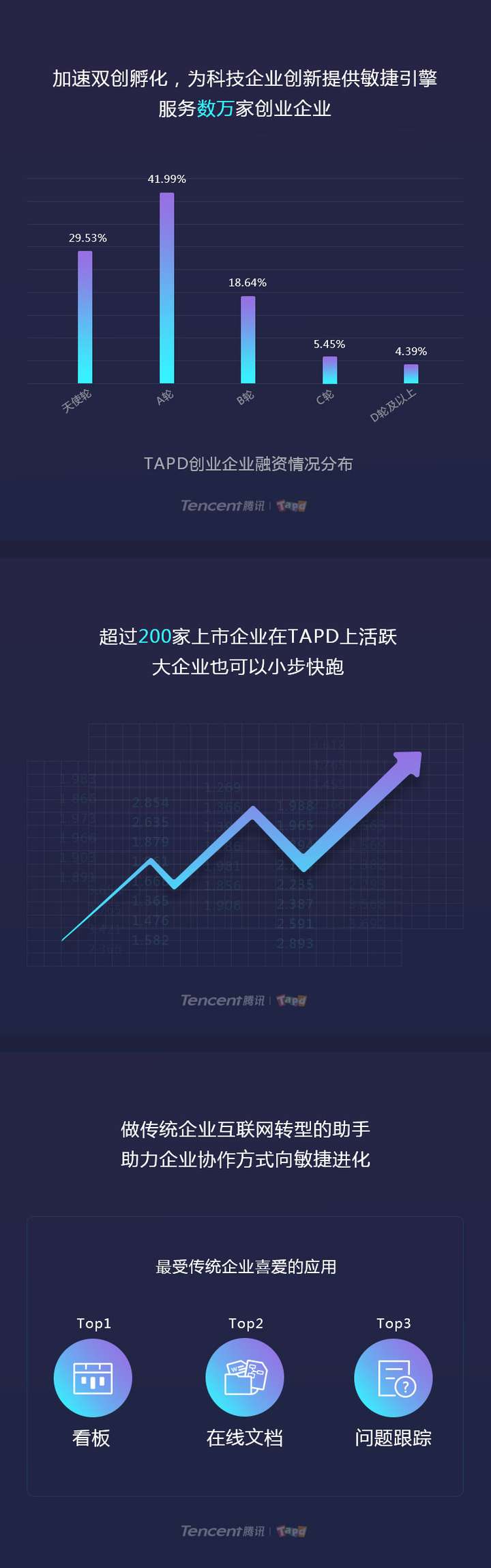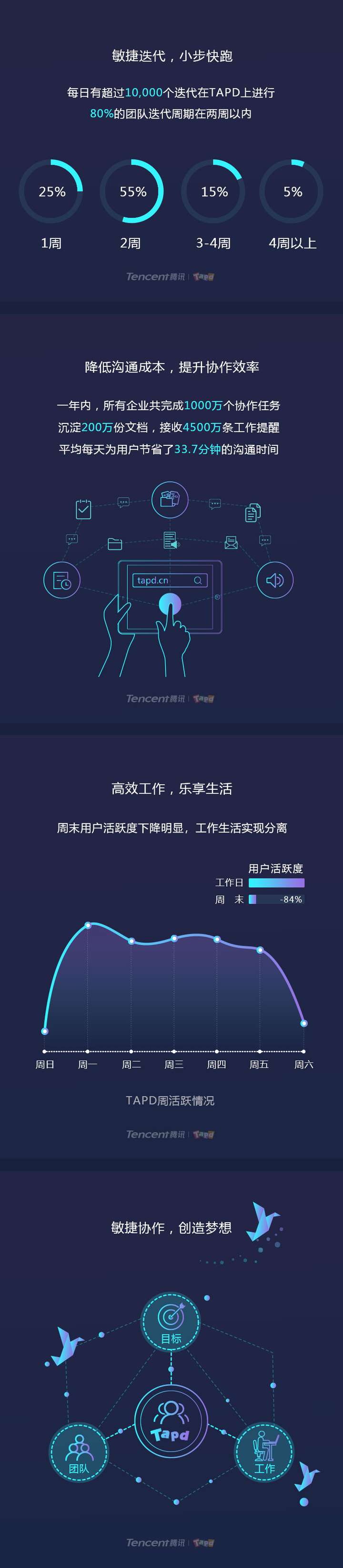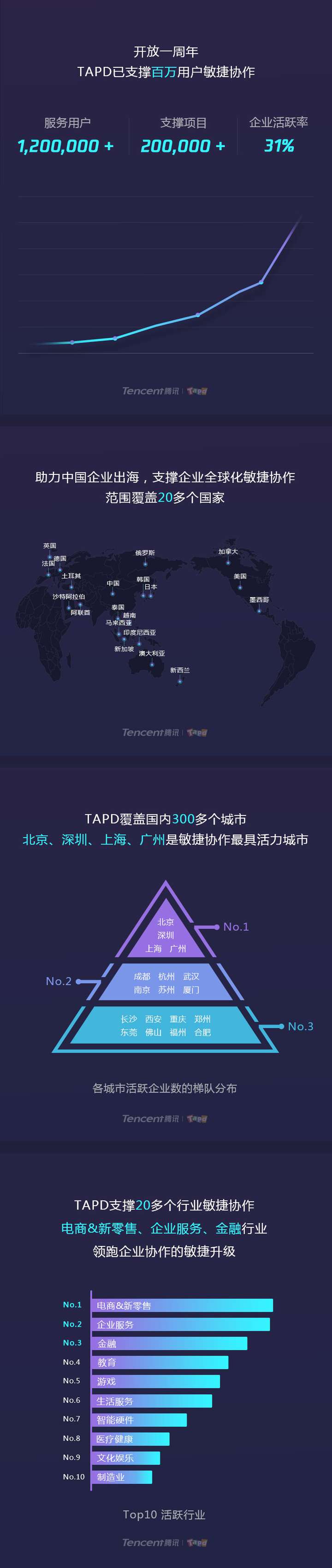 2017年5月,腾讯TAPD正式对外开放。TAPD提供轻量协作(可视化工作管理和在线文档协作)、敏捷研发(敏捷研发生命周期管理)和DevOps(研发运维一体化)三种解决方案,满足不同行业、不同场景用户的协作需求。目前已服务120万+用户,20万+项目,支撑企业敏捷协作,助力数字化转型升级。