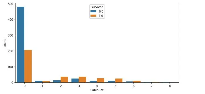 Cain特征有70%的缺失值,较为严重,如果进行大量的填补会引入更多噪声。因为缺失值也是一种值,这里将Cabin缺失值视为一种特殊的值来处理,并根据Cabin首个字符衍生一个新的特征CabinCat。