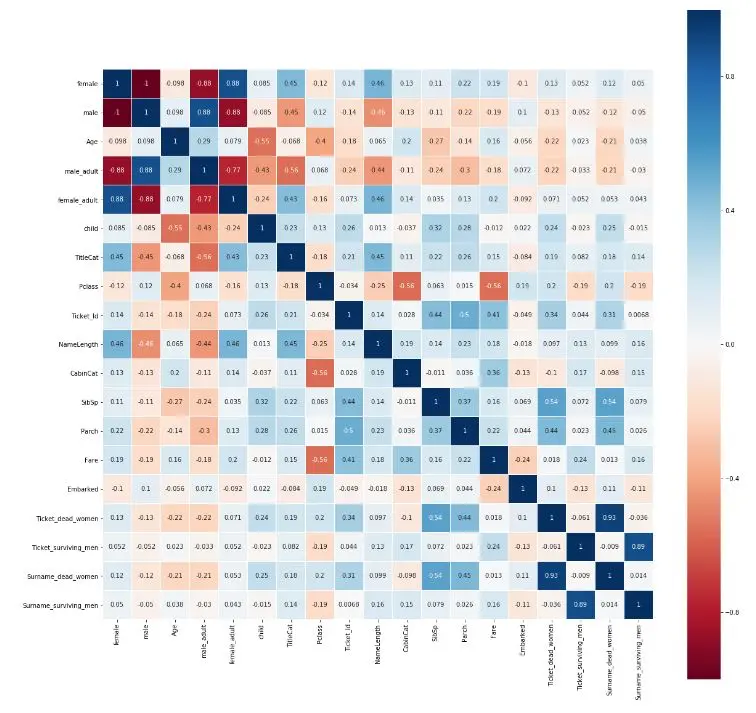 实际上,如果我们深入分析,Name特征是非常重要的。试想一下乘客有没有可能是和其他人一起上船的?是一家人?情侣?还是独自一人?而这一群人生还的概率应该是存在共性的,比如:有一个5人之家,有4人死亡,可以推测第5个人极有可能死亡。