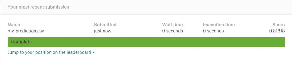 最后,将预测结果输出到excel表中。如果你到Kaggle将输出的数据提交,你应该得到的分数是:0.8188,也就是说你的准确率是0.8188。这个分数可以达到500/11000的排名(top5%)。
