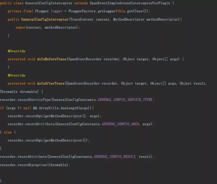 定义针对方法的拦截器 GeneralConfigInterceptor 继承自 SpanEventSimpleAroundInterceptorForPlugin,这里在方法执行后简单记录方法的名称,参数,返回值
