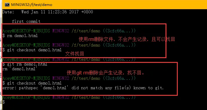 - git rm file命令:在删除的时候会将删除操作记录下来。