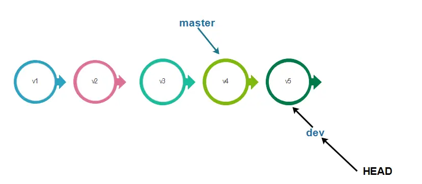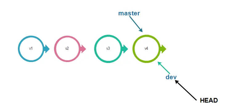 dev上,从而我们以后再提交时,master分支的指针将不会改变,而dev分支的指针会向前移动。