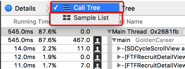 详情面板:在time profiler下主要是看Call Tree和Sample List这两种视图,一般使用Call Tree查看,比较简单明了: