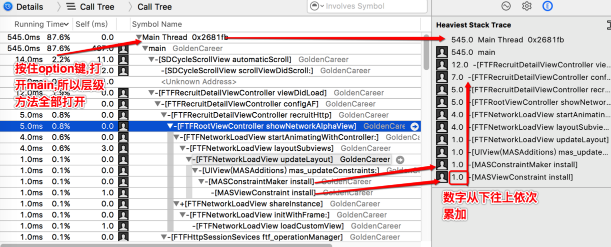 1.图标为黑色头像的就是Time Profiler给我们的提示,有可能存在性能瓶颈的地方