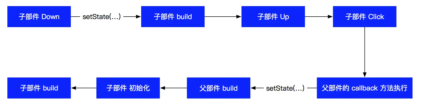 setState(...)方法,然后执行了一次 build 操作;而在 Up 事件中同样也调用了setState(...)方法,但是为什么没有执行 build 操作,而是直接执行了 click 操作。这里面可能和 Android 里面类似,在 View 的 onTouchEvent 方法里面,onClick 方法也是在 ACTION_UP 里面执行的。