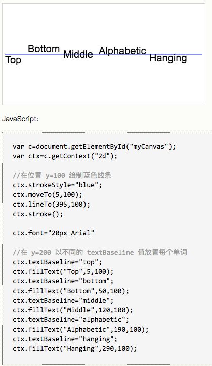 网页设计字体也有一个基线的存在,因此canvas的基线点就是直接从坐标点划出一条横线基线。这里从网络上截图一张,通过设置基线参考位置,看看文本所在位置的改变。