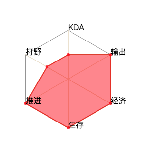 是不是有被我的战绩吓到了,害不害怕! 好了扯远了,让我们回到正题上来。 通过截图上面的雷达图基本主体是一个正六边形,每个顶点则配有相应的文字说明。 然后就是中间红色区域部分则由对角线上的点,连成一圈填充构成。因此这里我们称它为数据填充区,所以这个雷达图我们分为三步来完成: ①正六边形 ②数据填充区 ③绘制文本。