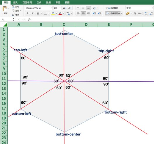 在绘画这个正六边形的时候,先让我们对于这个正六边形进行简单的数学分析。 这里先用画板画一个正六变形,然后进行切割并切角。