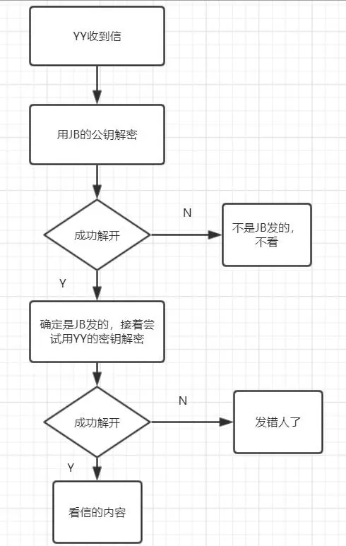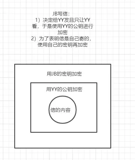 JB为了避免这种情况的发生,把信的内容用JB自己的密钥进行加密,YY收到信后,使用JB的公钥解密(只有JB的公钥才能解开使用JB私钥加密的内容),如果可以解开,那么YY就知道这封信的确是JB发的,这是为了确定消息发送方的份;
