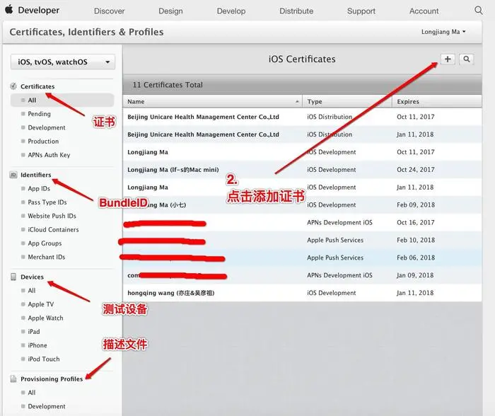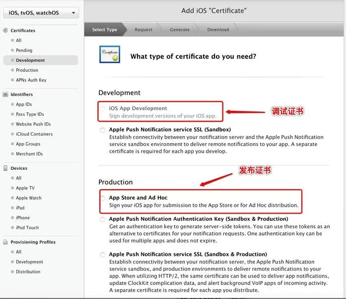 - 开发证书(Development):最多1个(20170425日只能生成一个了)